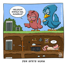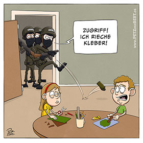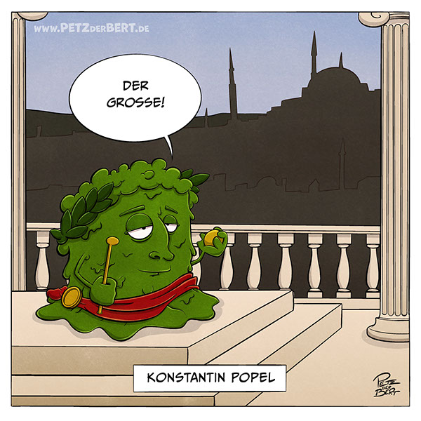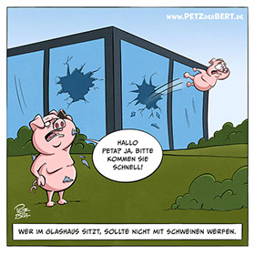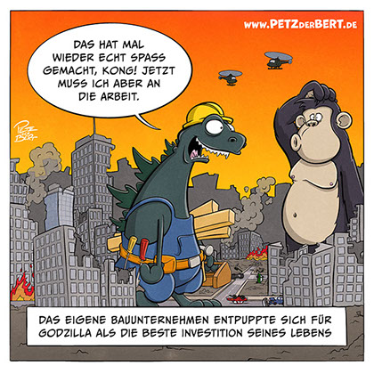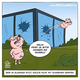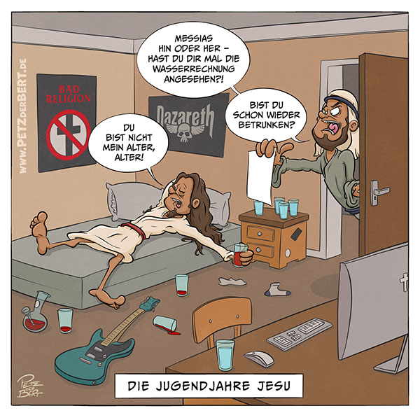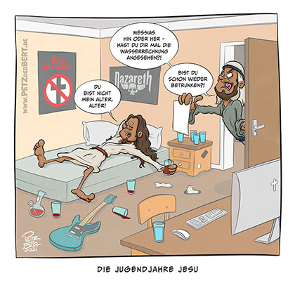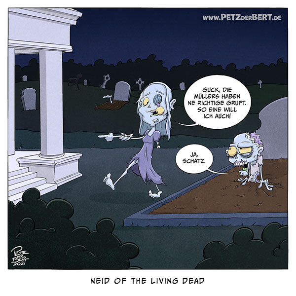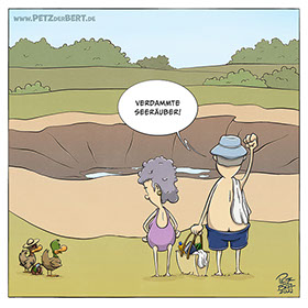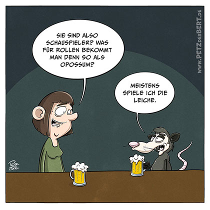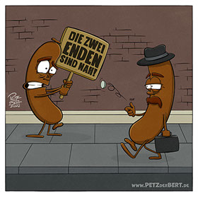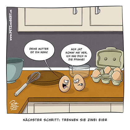Der selbsternannte Hobby-Cartoonist Patrick Schombert wurde 1982 in Essen geboren, zog dann aber alsbald in die weite Welt, um in Dortmund als Mediengestalter Fuß zu fassen. Seit ca. 2020 veröffentlicht er, unter dem Namen PetzDerBert, seine albernen Cartoons mehr oder weniger regelmäßig in den „sozialen“ Medien, war u.a. im Eulenspiegel vertreten und gehörte beim Deutschen Karikaturenpreis 2021 zu den drei Nominierten für den Preis zum Newcomer des Jahres. (Ein herzlicher Glückwunsch geht an dieser Stelle an Annika Frank!). Üblicherweise spricht er von sich nur sehr selten in der dritten Person.